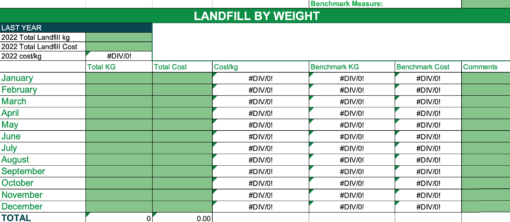 Use this template to note your 2022 waste baseline and benchmark and then to measure and monitor on a monthly basis going forward.