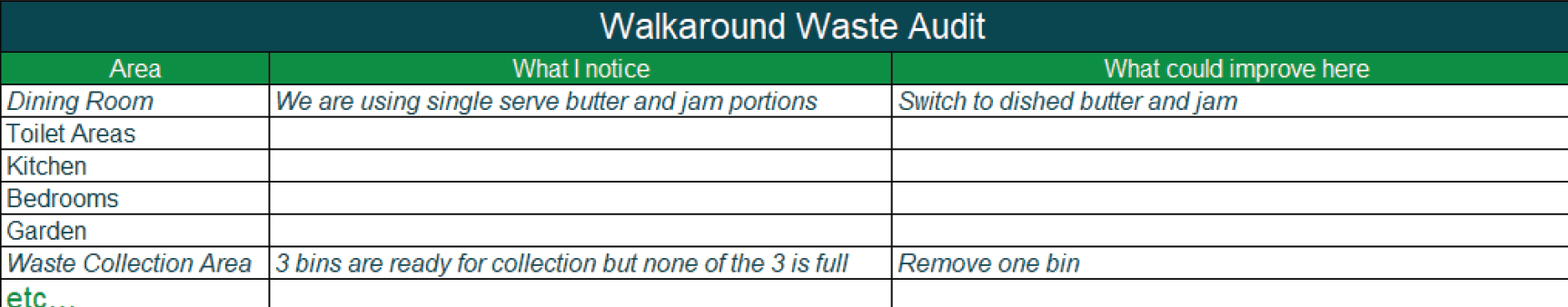 Use this table to note your observations during a during a Walkaround Waste Audit.
